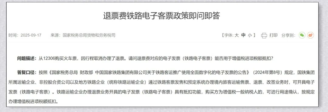 答复口径:按照《国家税务总局 财政部 中国国家铁路集团有限公司关于铁路客运推广使用全面数字化的电子发票的公告》(2024年第8号)规定,国铁集团所属运输企业、非控股合资公司以及地方铁路企业(统称铁路运输企业)通过铁路客票发售和预定系统办理境内旅客运输售票、退票、改签业务时,可开具电子发票(铁路电子客票)。铁路运输企业办理退票业务开具的电子发票(铁路电子客票)具有抵扣功能,购买方为增值税一般纳税人的,可进行用途确认,按规定办理增值税进项税额抵扣。