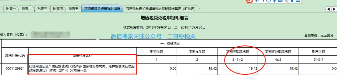这里的减税性质名称选择的是财税[2014]57号,抵减税额为19.42,3%征收率减按2%征收,享受的减征额为
