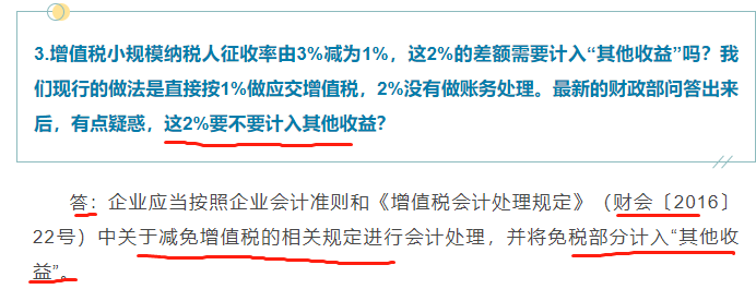 当然,在你分析这两个分录的过程中,也能回复有些朋友的另外一个问题了,那就是3%减按1%,那2%的减免的部分是否缴纳企业所得税呢?