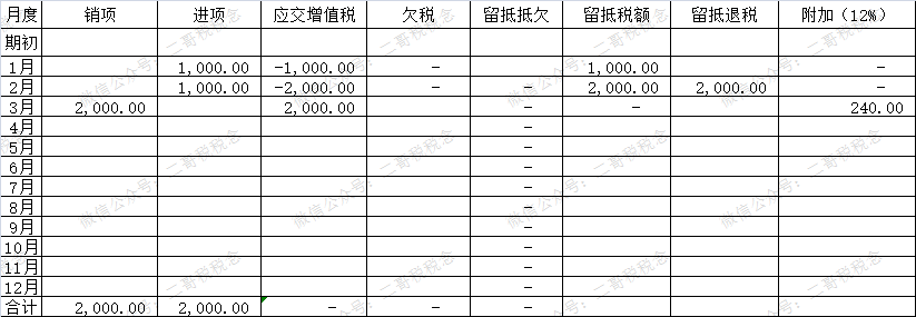 情况1、3月产生了销项税2000,那么如果企业不申请留抵退税,截止到3月应交增值税是0,留抵税额也是0,累计缴纳附加也还是0。