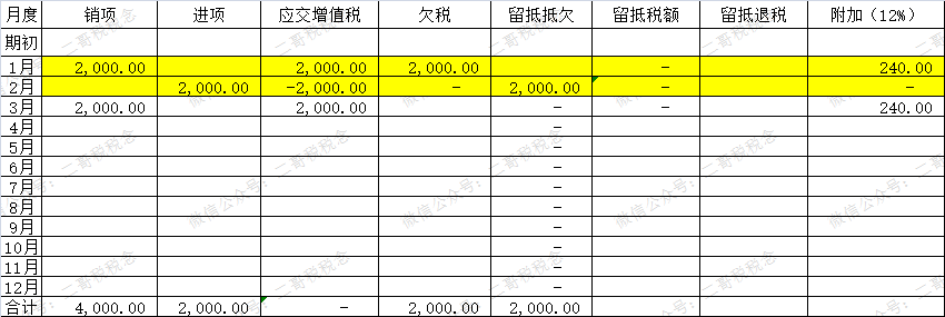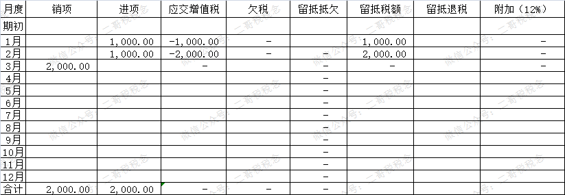 比如,如图,二哥税税念公司1月2月都是留抵,累计留抵2000。