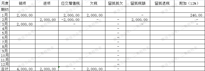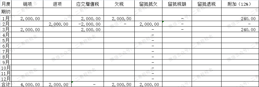 比如,二哥税税念公司1月欠税2000,2月又有留抵2000,但是没有抵欠,3月产生2000销项,那么累计来看,欠税2000,附加240。