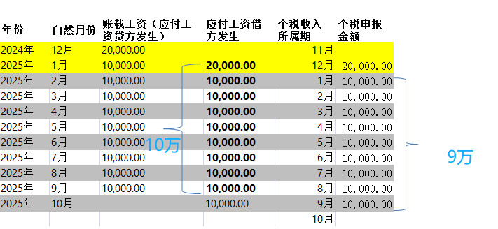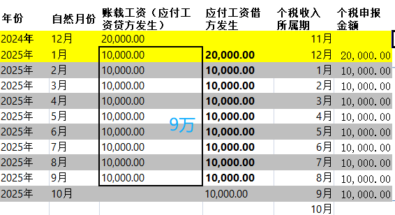 然后1月份申报个人所得税时候,公司直接就按2万申报了,个税税款所属期是2024年12月,如图,黄色区域个人所得税收入所属期。