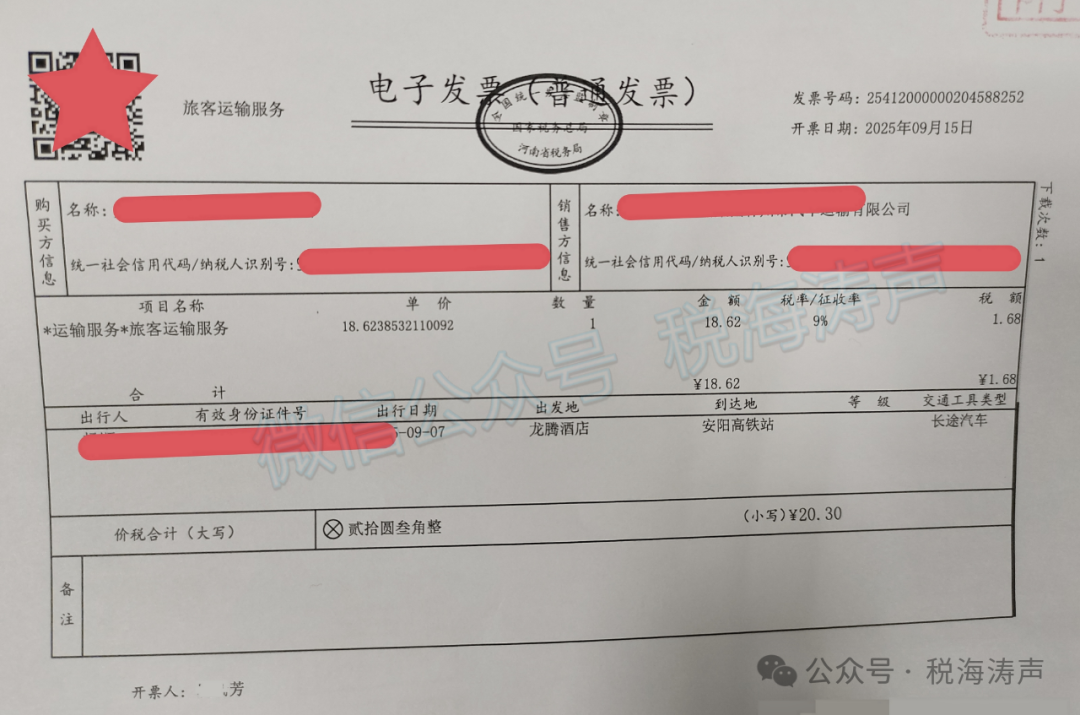 这位网民贴出的是一份数电发票,具体细说是”旅客运输服务的电子发票(普通发票)”,按票面要素完整填写了“购买方信息”“销售方信息”,以及旅客身份信息,出发地、到达地等项目,从填开内容看,是符合规定的。