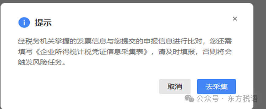 这个预警提示主要是对企业的成本费用进行比对,主要是包括取得的发票成本和无票的成本,如果税务机关掌握的发票信息与纳税人提交的申报信息比对差异率超出设定指标,则要进一步要求纳税进一联填写《企业所得税计税凭证信息采集表》,如果不填写,可以会触发风险任务。