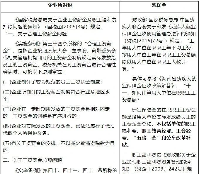 所实际发生的费用,应区分为工资薪金支出和职工福利费支出。其中属于工资薪金支出的,准予计入企业工资薪金总额的基数,作为计算其他各项相关费用扣除的依据。而返聘离退休人员无法和企业签订劳动合同,则不应纳入残保金的工资总额基数。