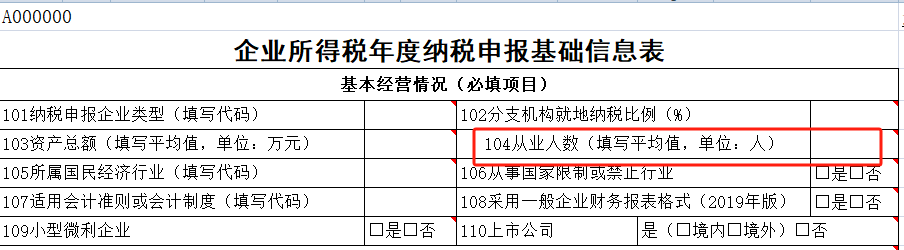 “104从业人数”:纳税人填报从业人数的全年季度平均值,单位为人。从业人数是指与企业建立劳动关系的职工人数和企业接受的劳务派遣用工人数之和。