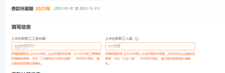 预填数据取自【2023年度】企业所得税年报表“A105050职工薪酬纳税调整明细表”中的“工资薪金支出税收金额”,您可自行修改,请注意申报数据的准确性。