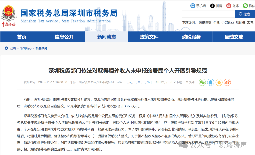 前期,广东税务部门根据税收大数据分析线索,发现境内居民刘某存在取得境外收入未申报缴税疑点,税务机关对其进行提示提醒和政策辅导后,该纳税人积极配合自查整改,补充申报境外所得并依法补缴税款、滞纳金合计170万元。