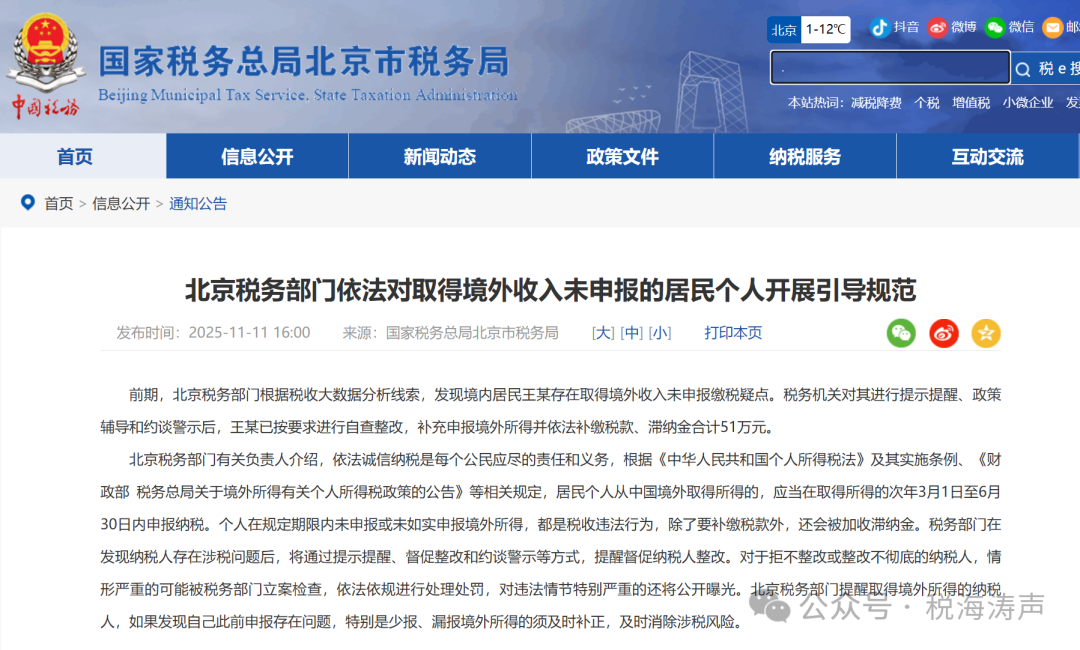 前期,北京税务部门根据税收大数据分析线索,发现境内居民王某存在取得境外收入未申报缴税疑点。税务机关对其进行提示提醒、政策辅导和约谈警示后,王某已按要求进行自查整改,补充申报境外所得并依法补缴税款、滞纳金合计51万元。