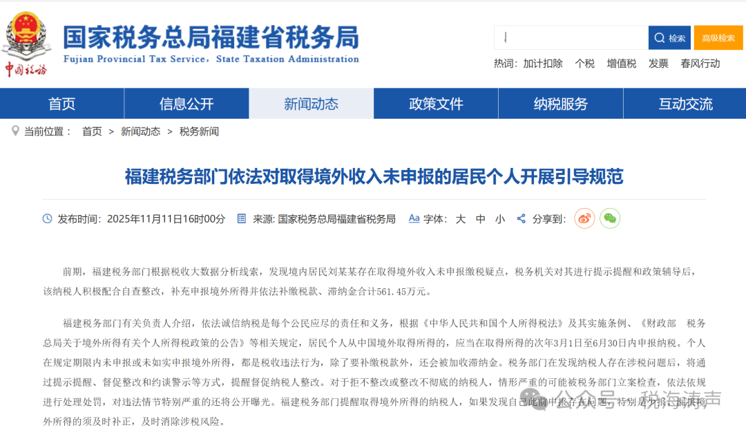 福建税务部门根据税收大数据分析线索,发现境内居民刘某某存在取得境外收入未申报缴税疑点,税务机关对其进行提示提醒和政策辅导后,该纳税人积极配合自查整改,补充申报境外所得并依法补缴税款、滞纳金合计561.45万元。