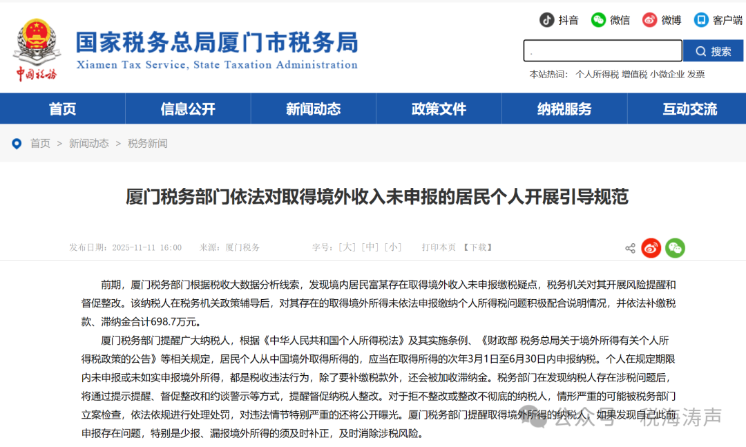 前期,厦门税务部门根据税收大数据分析线索,发现境内居民富某存在取得境外收入未申报缴税疑点,税务机关对其开展风险提醒和督促整改。该纳税人在税务机关政策辅导后,对其存在的取得境外所得未依法申报缴纳个人所得税问题积极配合说明情况,并依法补缴税款、滞纳金合计698.7万元。