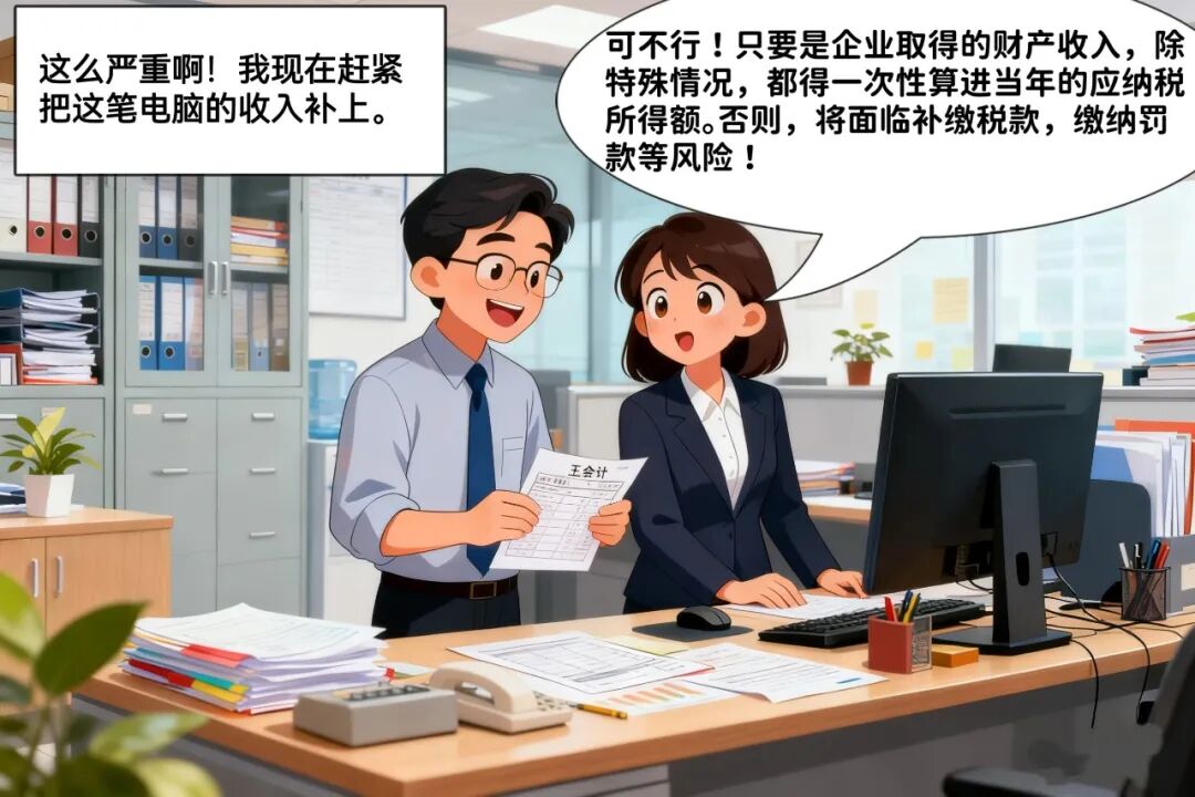 企业对于取得财产,无论是否为货币形式,未一次性计入应纳税所得额,未计收入减少应纳税所得额,将面临补缴税款,缴纳罚款等风险。