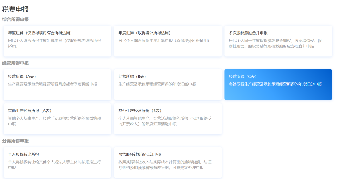 取得多处经营所得——选择向其中一处经营管理所在地主管税务机关办理年度汇总申报——填《个人所得税经营所得纳税申报表(C表)》。