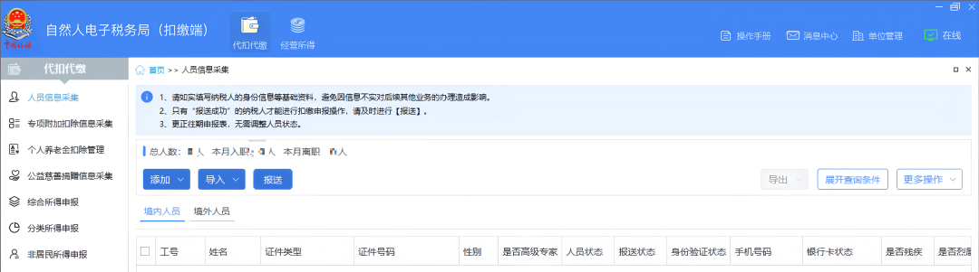一、登录自然人电子税务局(扣缴端)后,点击【代扣代缴】模块【人员信息采集】,将相关人员信息采集并报送成功。