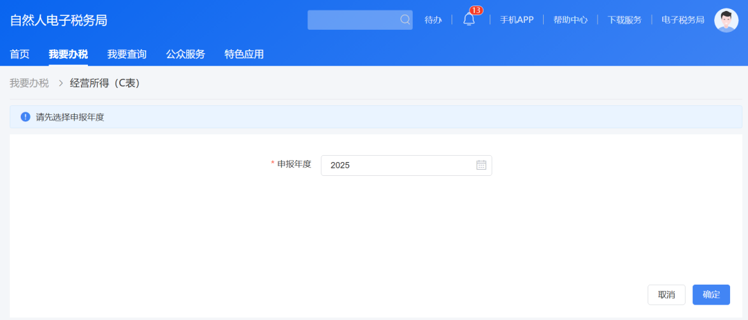 一、登录自然人电子税务局后,点击【我要办税】-【经营所得(C表)】进入申报界面。
