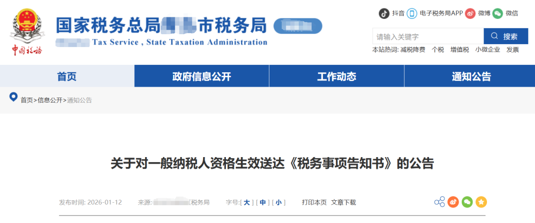 近日,一地税务机关向四家企业作出《税务事项通知书(增值税一般纳税人资格生效告知)》,告知相关企业年应征增值税销售额已超过小规模纳税人标准,根据《增值税法》及其实施条例、《国家税务总局关于增值税一般纳税人登记管理有关事项的公告》(国家税务总局公告2026年第2号)的规定,企业的一般纳税人资格自2026年1月1日起生效。