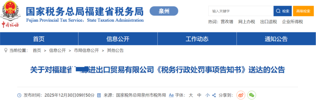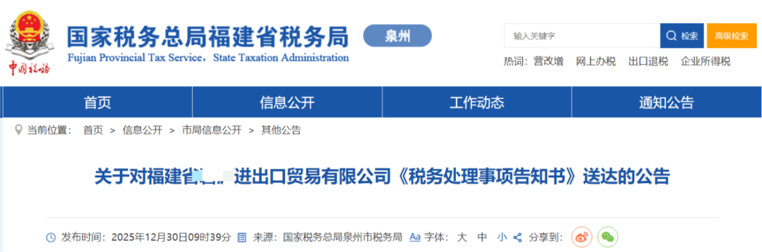 对你公司的税收违法行为拟于2026年1月31日之前作出税务处理决定,根据《中华人民共和国税收征收管理法》第八条第四款、《福建省行政执法条例》第二十九条、《税务稽查案件办理程序规定》第四十条规定,现将有关事项告知如下: