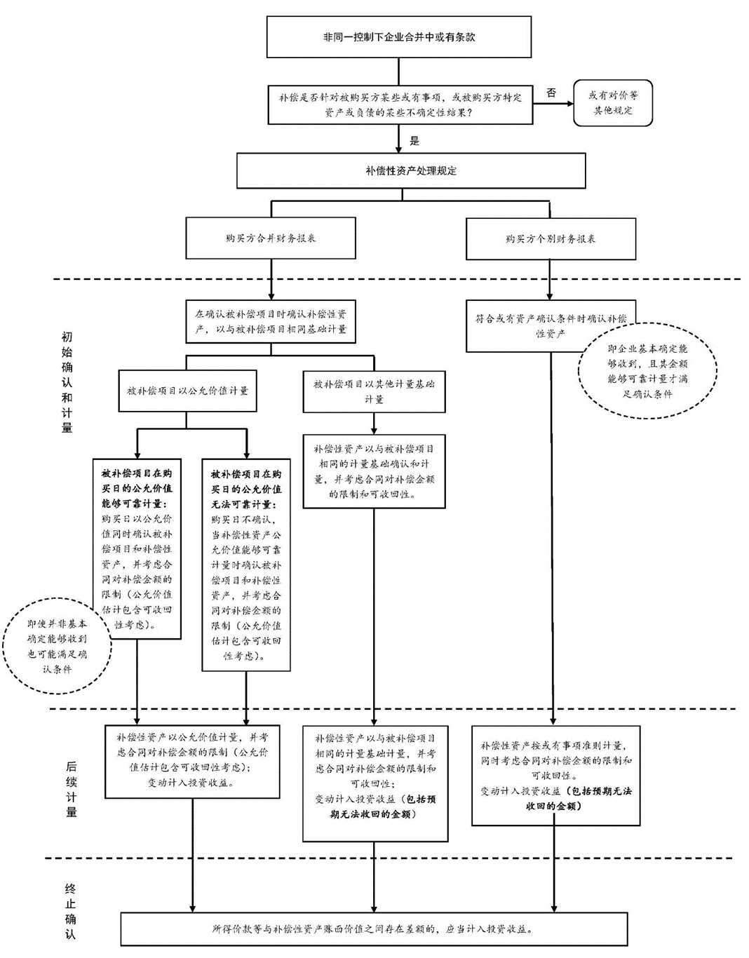 根据《准则解释19号》本问题规定,非同控制下企业合并中补偿性资产的会计处理思路如下图所示: