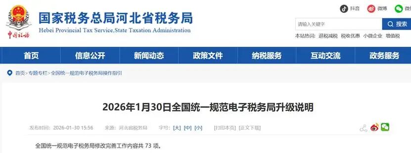 全国统一规范电子税务局修改完善工作内容共 73 项。