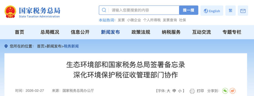 近日,生态环境部与国家税务总局在京签署了《深化环境保护税征收管理部门协作备忘录》,标志着两部门在环境保护税征管领域的合作进入新阶段。此次备忘录的签署旨在贯彻落实党中央关于完善绿色税制、推动绿色低碳发展的决策部署,重点围绕信息共享、征管服务、常态复核、联合监管等方面深化协作。