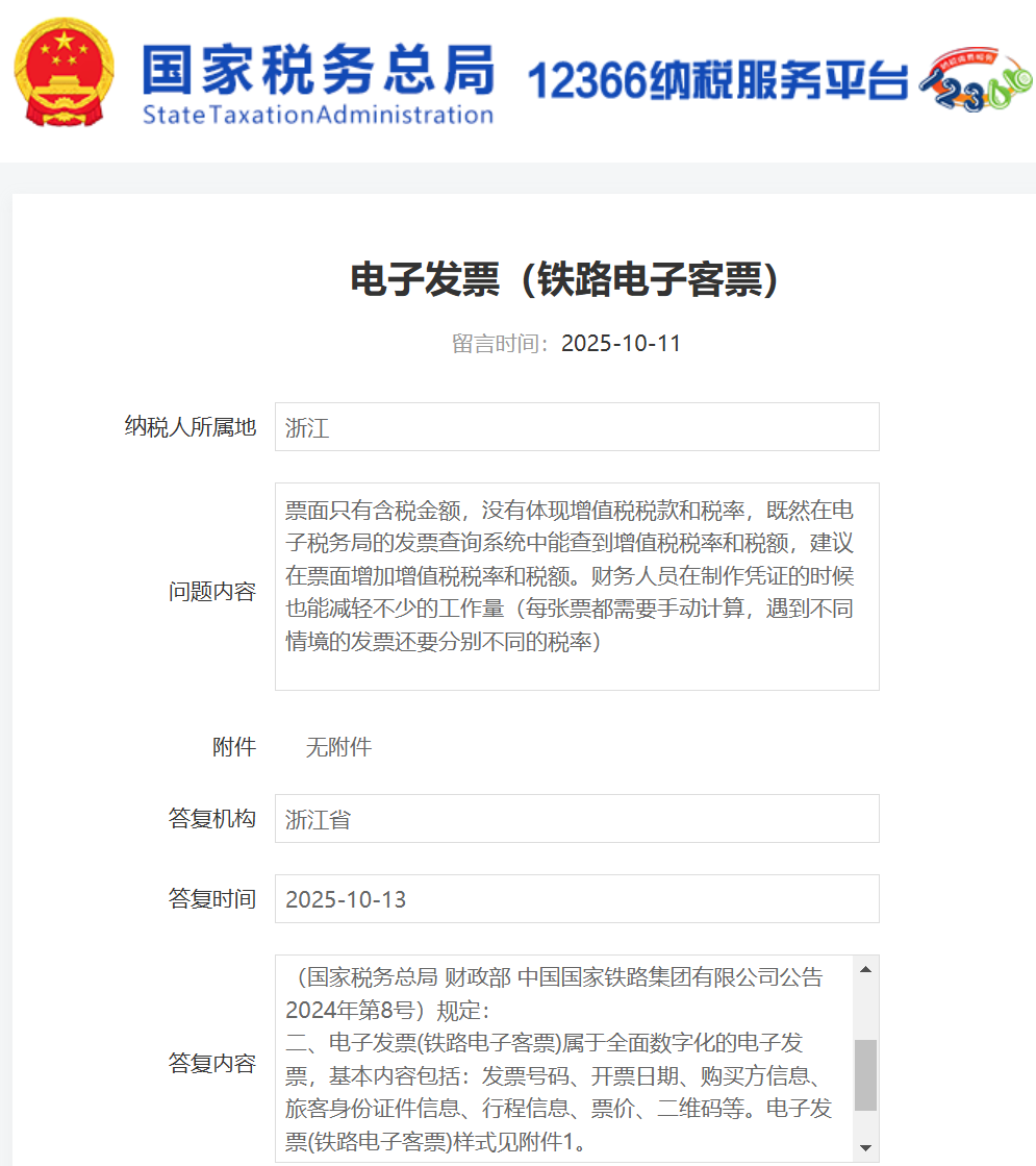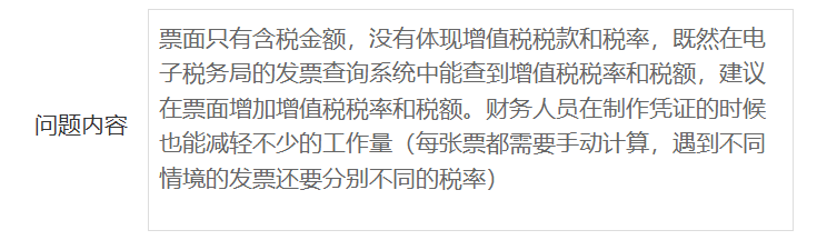 【问题内容】票面只有含税金额,没有体现增值税税款和税率,既然在电子税务局的发票查询系统中能查到增值税税率和税额,建议在票面增加增值税税率和税额。财务人员在制作凭证的时候也能减轻不少的工作量(每张票都需要手动计算,遇到不同情境的发票还要分别不同的税率)