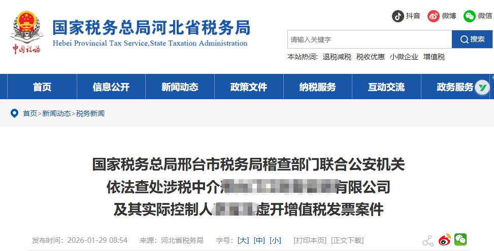 29日,河北一家涉税中介操控9个空壳个体户,虚开发票金额高达4580万元。目前,税务部门已依法定性虚开并稽查下游企业,公安机关正深入侦办中。