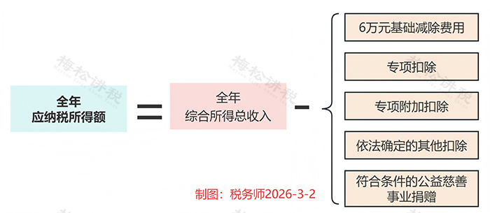 公式一:算全年应纳税所得额(能扣的都减掉)