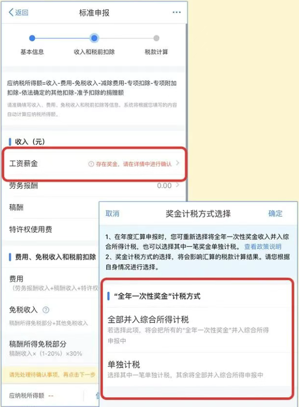 2、进入收入和税前扣除界面→重点点击【工资薪金】板块,确认年终奖计税方式(单独计税/合并计税),两种方式都试一遍,选择最优的,其他收入和扣除项核对无误后点【下一步】。