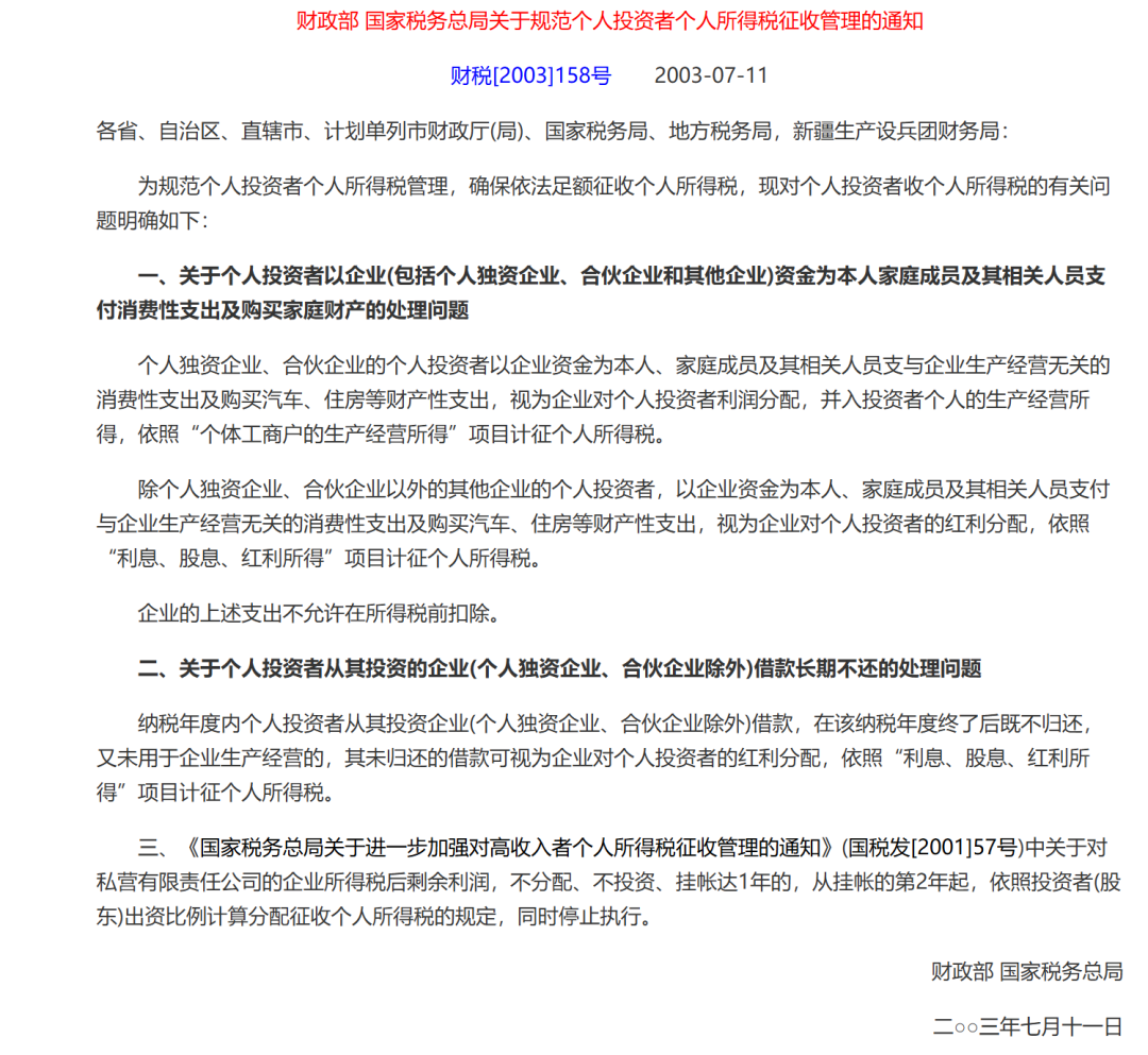 《财政部 国家税务总局关于规范个人投资者个人所得税征收管理的通知》(财税〔2003〕158号)第二条