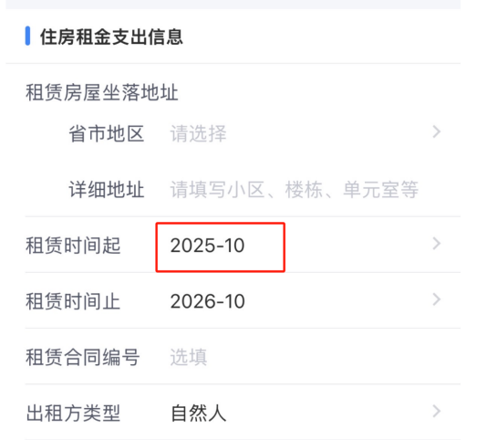 举例:小李2025年4月租了一套房,租期到当年9月30日,但因工作地变更,9月初他又在新工作地附近租了一套房,这样一来,9月份两套房子就都在租期之内了。这种情况下,小李在填报“住房租金专项附加扣除信息”时,就可以保持之前的信息不变,新的住房“租赁时间起”填写为2025年10月,这样两处房子的租房起止时间就不会重叠了。