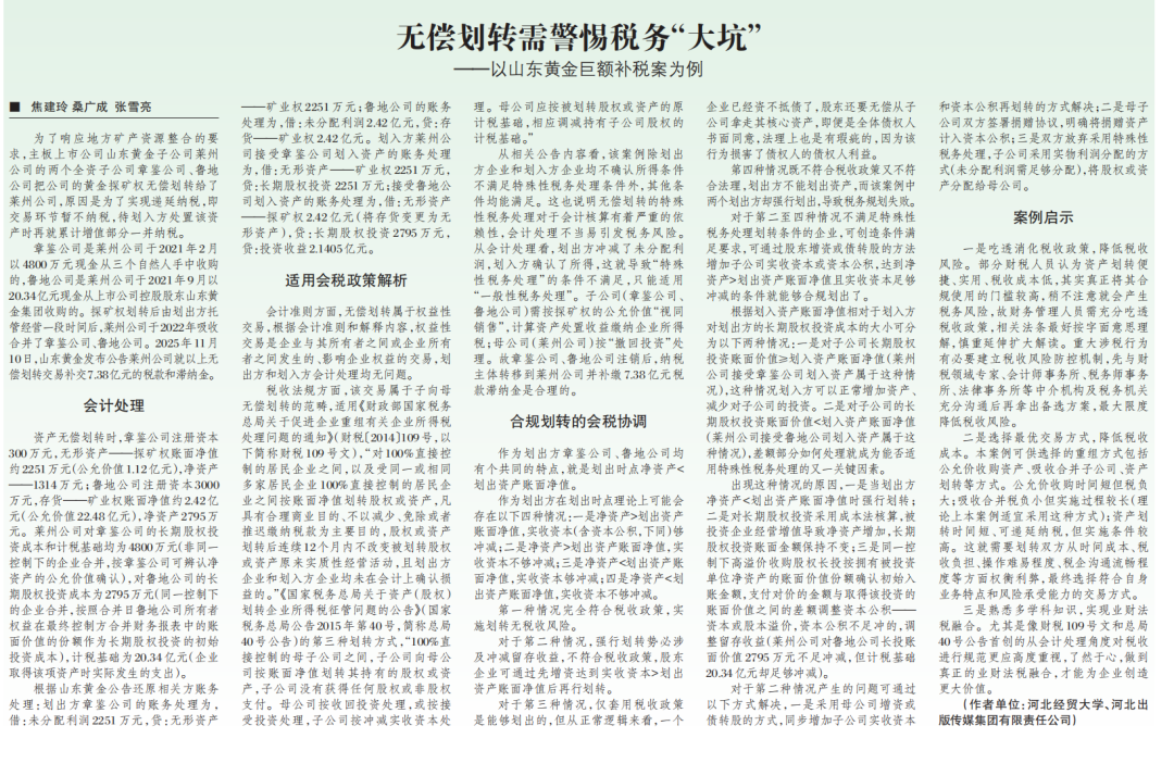为了响应地方矿产资源整合的要求,主板上市公司山东黄金子公司莱州公司的两个全资子公司章鉴公司、鲁地公司把公司的黄金探矿权无偿划转给了莱州公司(原因是为了实现递延纳税,即交易环节暂不纳税,待划入方处置该资产时再就累计增值部分一并纳税)。章鉴公司是莱州公司于2021年2月以4800万元现金从三个自然人手中收购的,鲁地公司是莱州公司于2021年9月以20.34亿元现金从上市公司控股股东山东黄金集团收购的。探矿权划转后由划出方托管经营一段时间后,莱州公司于2022年吸收合并了章鉴公司、鲁地公司。2025年11月10日,山东黄金发布公告莱州公司就以上无偿划转交易补交7.38亿元的税款和滞纳金。
