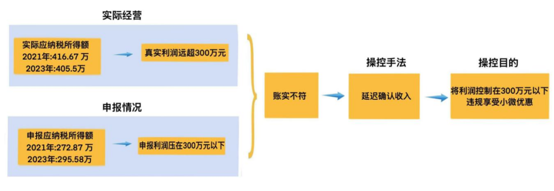 经核实,2021年该驾校合同载明收入及银行流水测算的应纳税所得额为416.67万元,申报为272.87万元;2023年实际为405.5万元,申报数为295.58万元。企业刻意将应纳税所得额控制在300万元小型微利企业标准线以下,违规享受小微企业税收优惠政策。