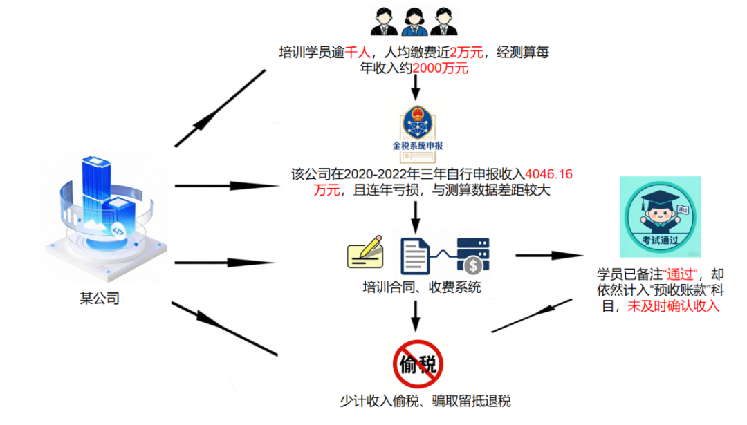 检查人员通过公司报名收费系统看到,名单中明明大量学员已备注“通过”,却依然计在“预收账款”科目,未及时确认收入,同时,企业仍对因未确认收入形成的7.91万元增值税留抵税额申请退税,存在骗取留抵退税问题。