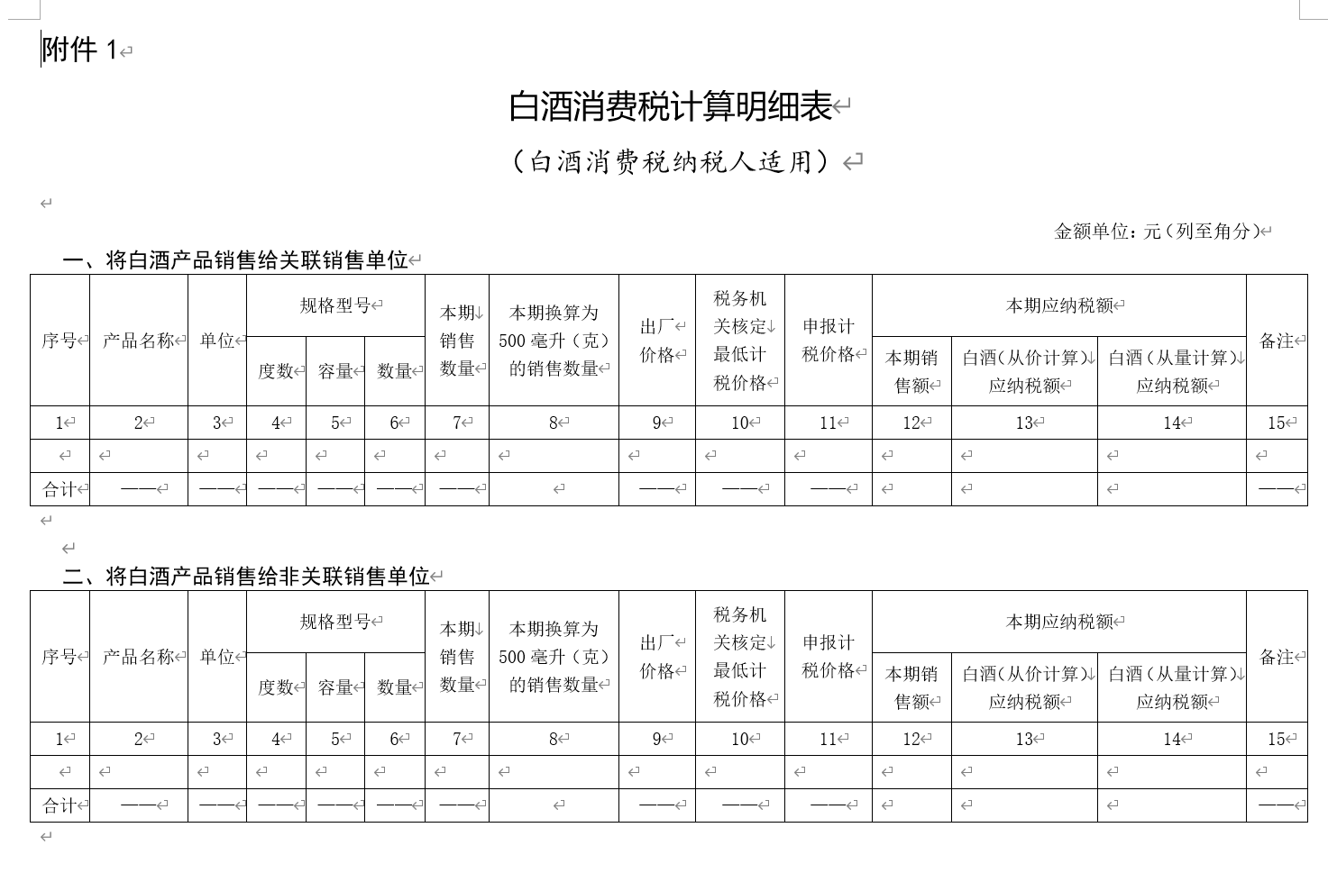 一、增加《白酒消费税计算明细表》作为《消费税及附加税费申报表》附表6,详见附件1。
