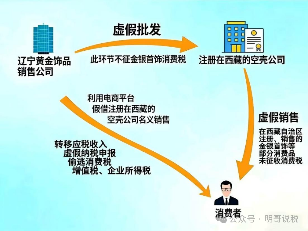 根据相关政策要求,西藏自治区对在本地注册、销售的金银首饰等消费品,暂未征收消费税。结合这个情况,税务人员初步判断潮尊公司“沈阳批发、西藏零售”的模式,存在转移应税收入、偷逃消费税的嫌疑。