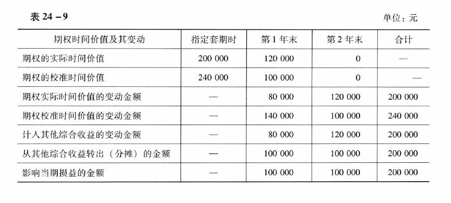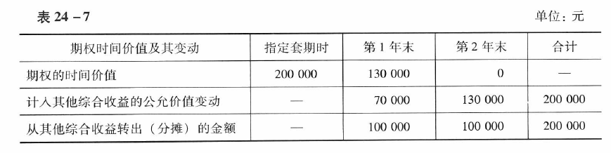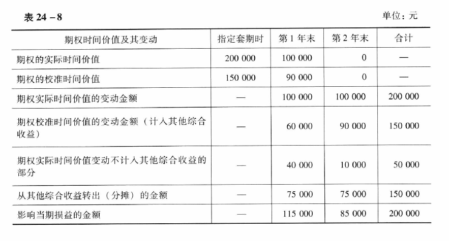 由于期权被指定时的实际时间价值为200  000元,假定其开始时的校准时间价值也为200 000元,因此,期权实际时间价值等于权准时间价值。假定期权的时间价值在第1年末全额为130 000元。