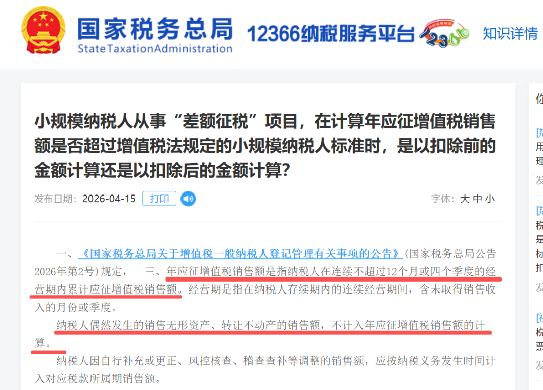一、《国家税务总局关于增值税一般纳税人登记管理有关事项的公告》(国家税务总局公告2026年第2号)规定,“三、年应征增值税销售额是指纳税人在连续不超过12个月或四个季度的经营期内累计应征增值税销售额。经营期是指在纳税人存续期内的连续经营期间,含未取得销售收入的月份或季度。
